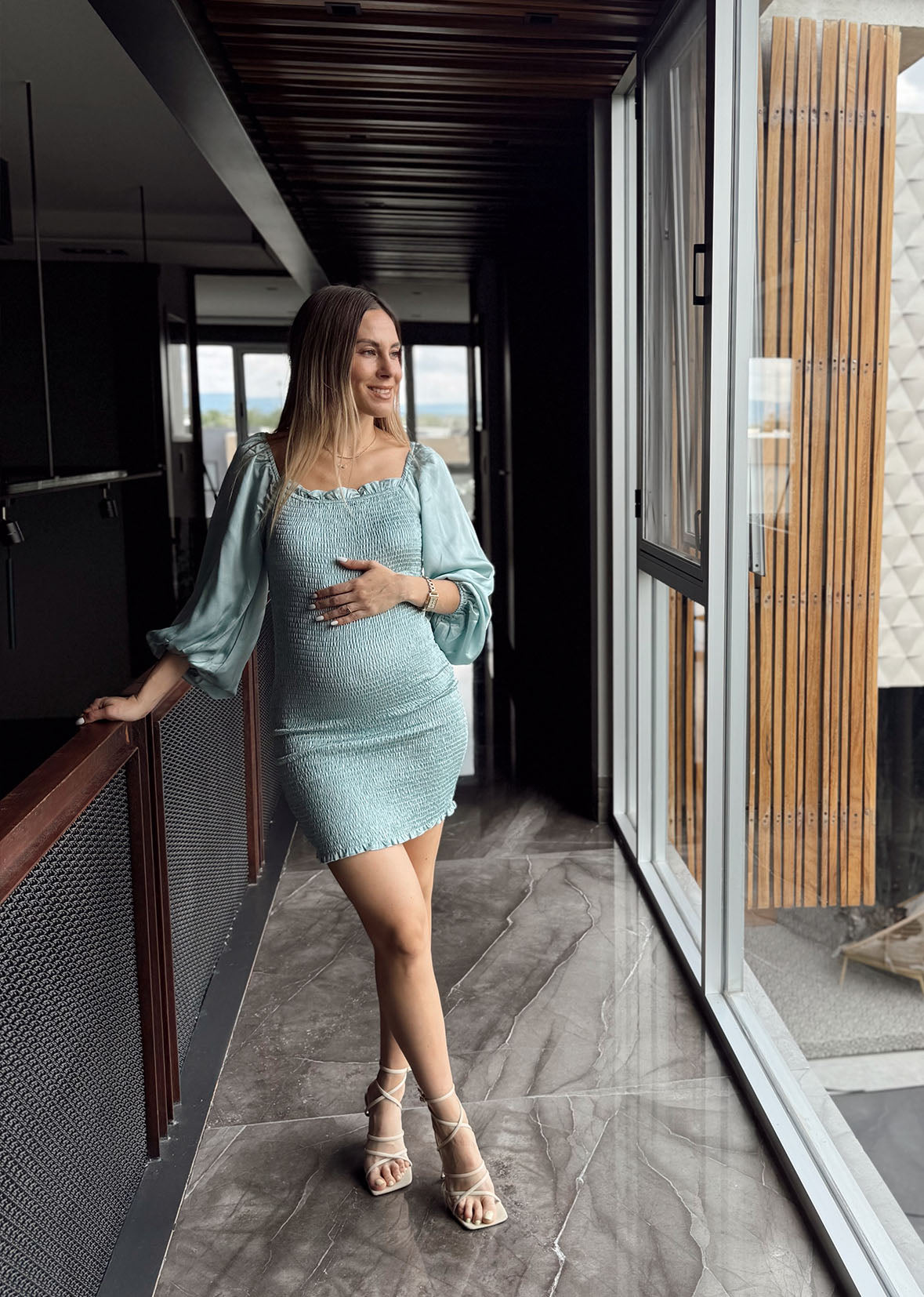 Vestido corto elástico drapeado azul cielo manga suelta. (Como referencia la modelo luce talla S)