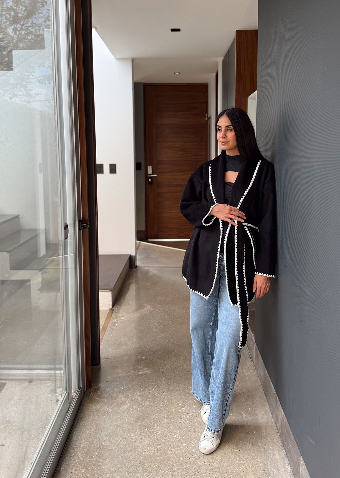 Cardigan tipo abrigo negro afelpado con cinto y costuras blancas. Se puede usar también después de tu embarazo.