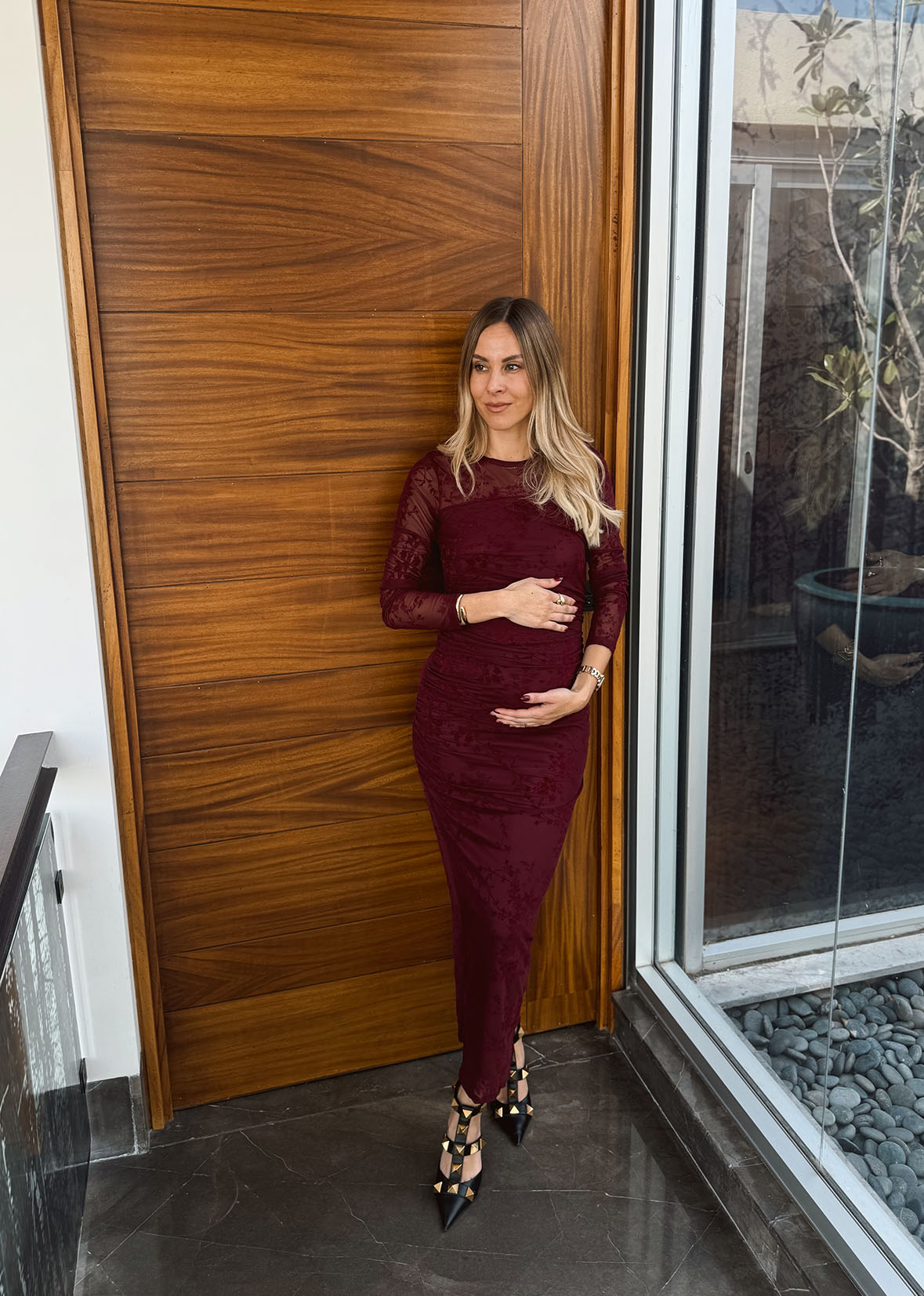 Vestido burgundy estampado flores velvet con fondo incluído, transparencia en la parte de hombros y brazos.